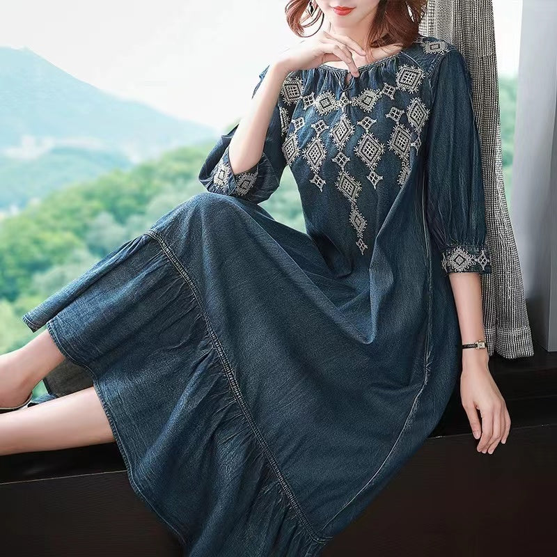 Art Blue O Neck Embroidered Denim Short Sleeve Dress