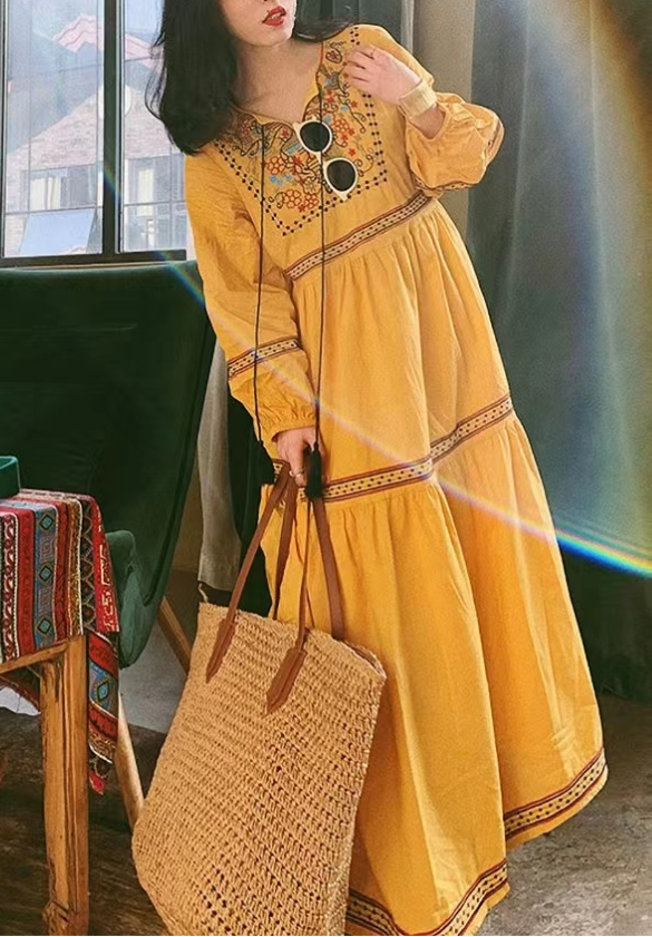 Bohemian Tie Embroidered Sun Screen Long Sleeve Patchwork Dress