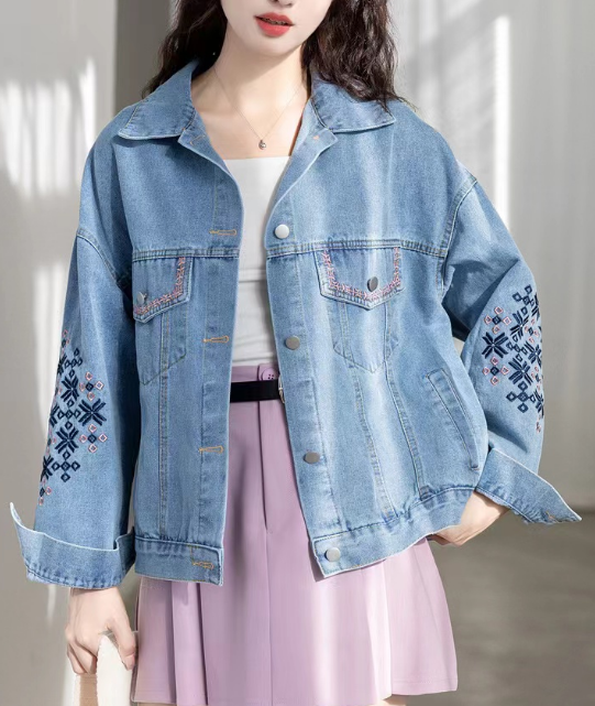 Casual Embroidered Geometric Color Clash Denim Jacket