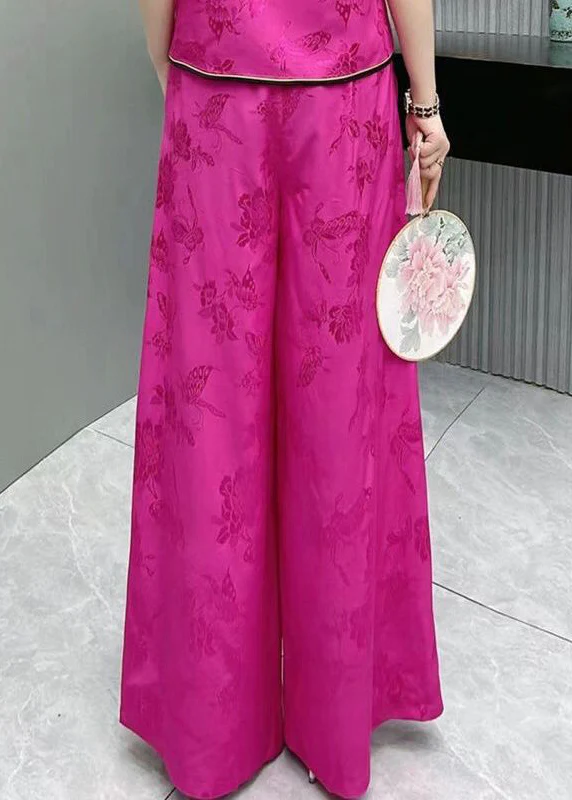Elegant Embroidery High Waist Pocket Patchwork Silk Wide Leg Pants