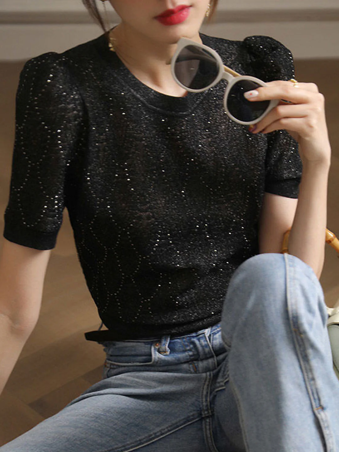 Elegant Round Neck Hollow Out Perm Knit Short Sleeve Shirt Top