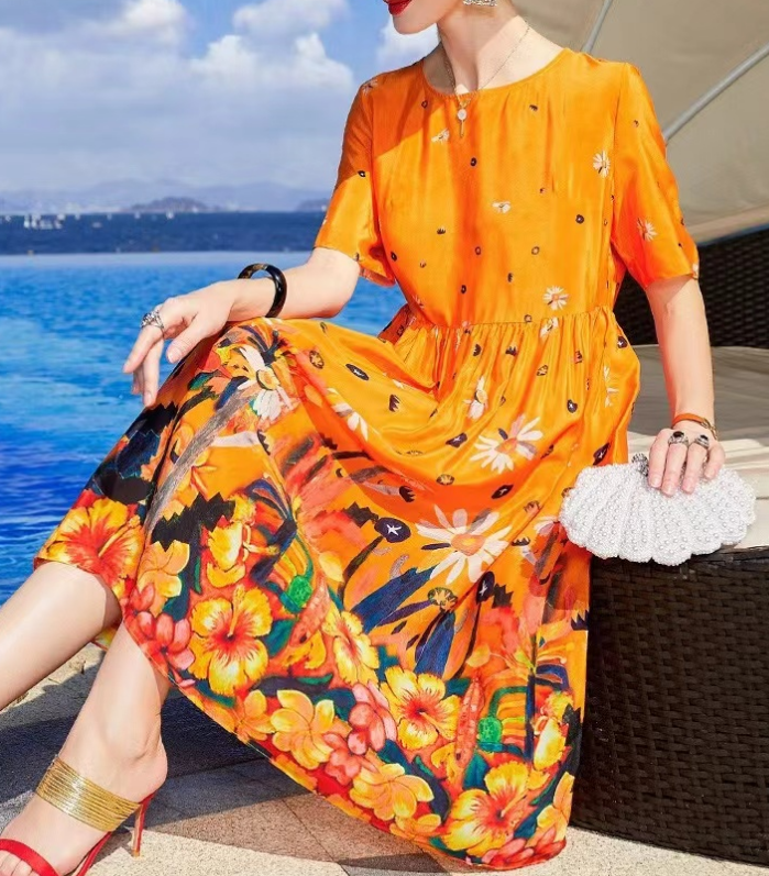 Elegant Round Neck Silk Printed Short Sleeve Hem Dress