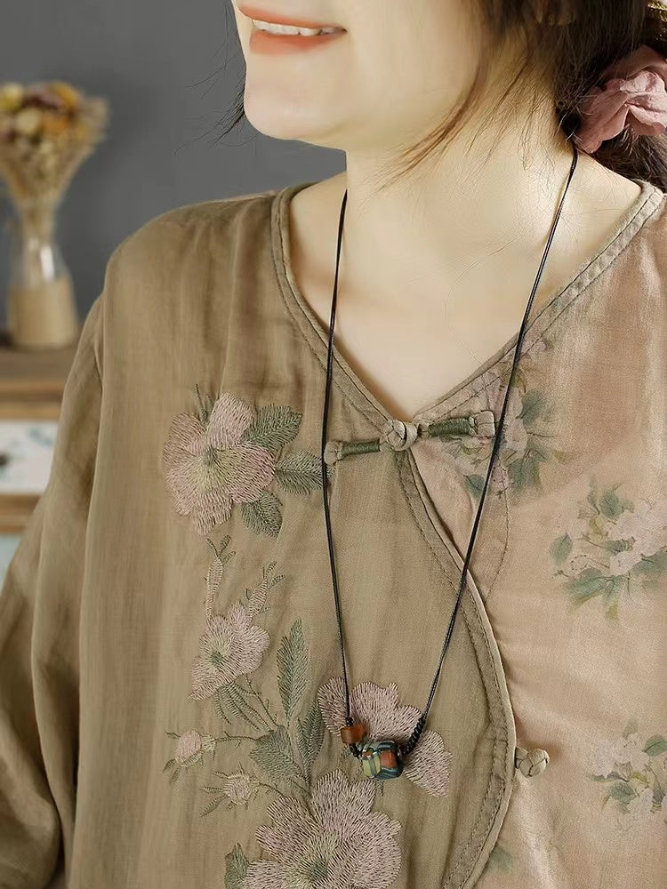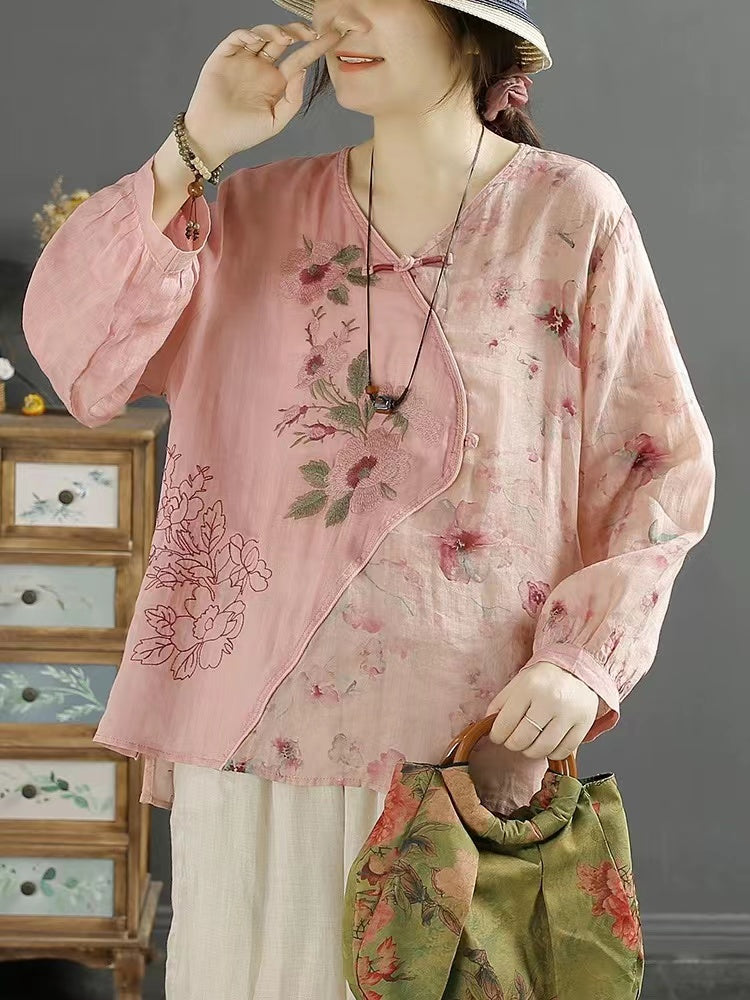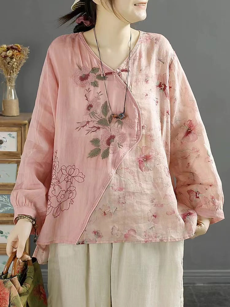 Fashion Embroidery Asymmetric Patchwork Cotton Long Sleeve Shirt Top