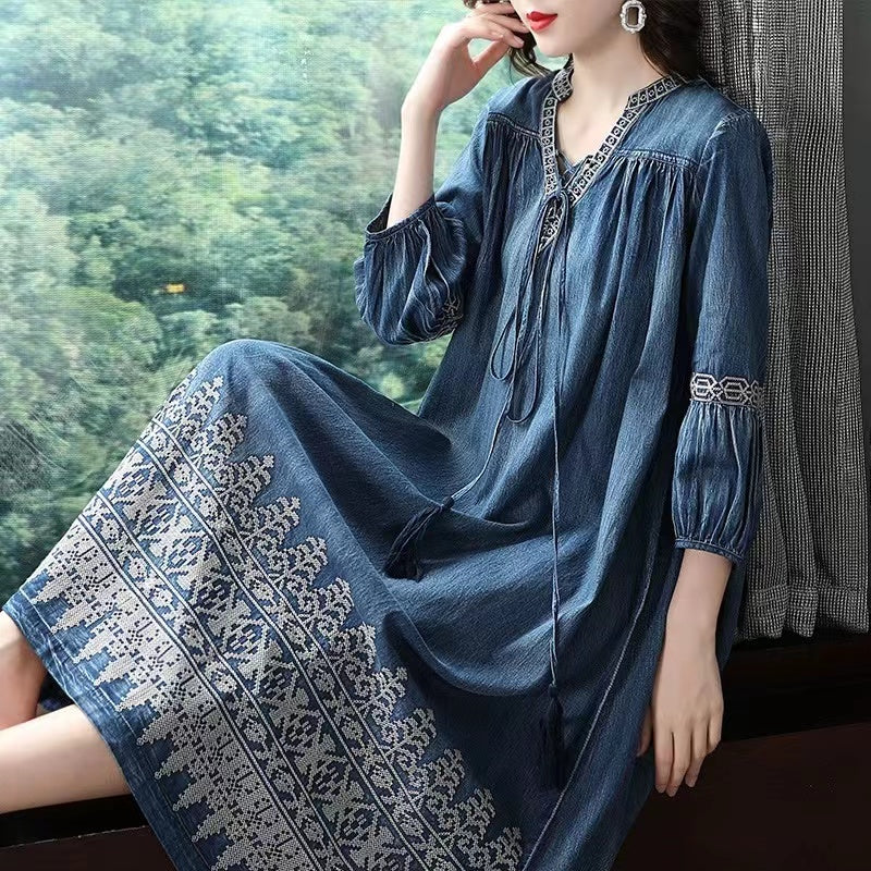 French V-Neck B Tie Patchwork Embroidered Denim Dress