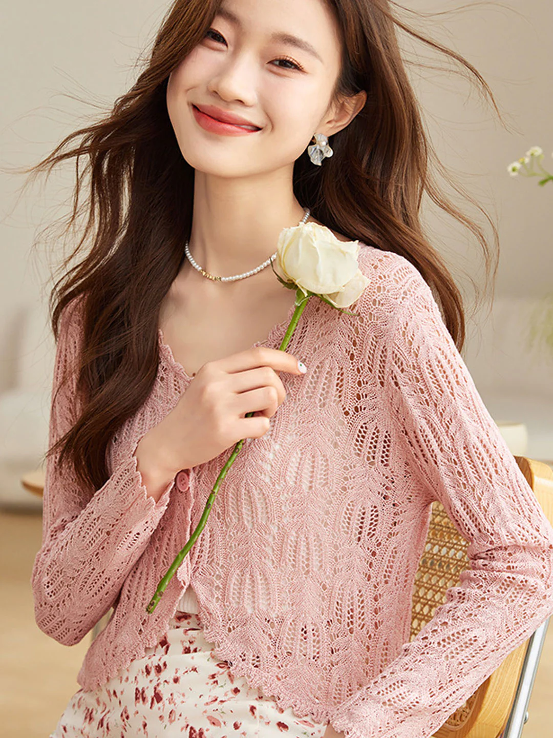 French V-Neck Hollow Out Ice Silk Knit Cardigan Top
