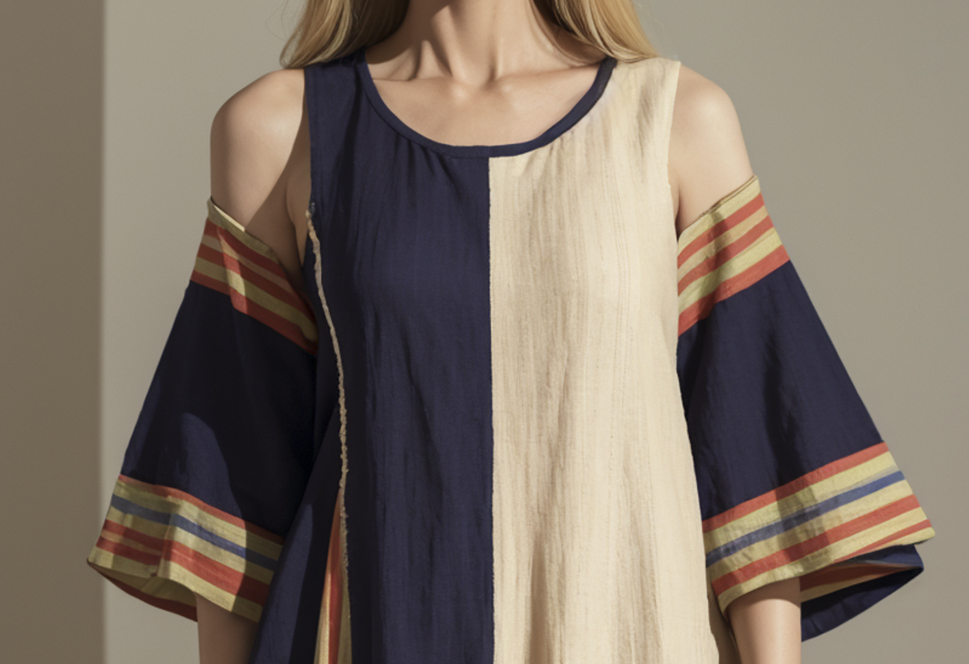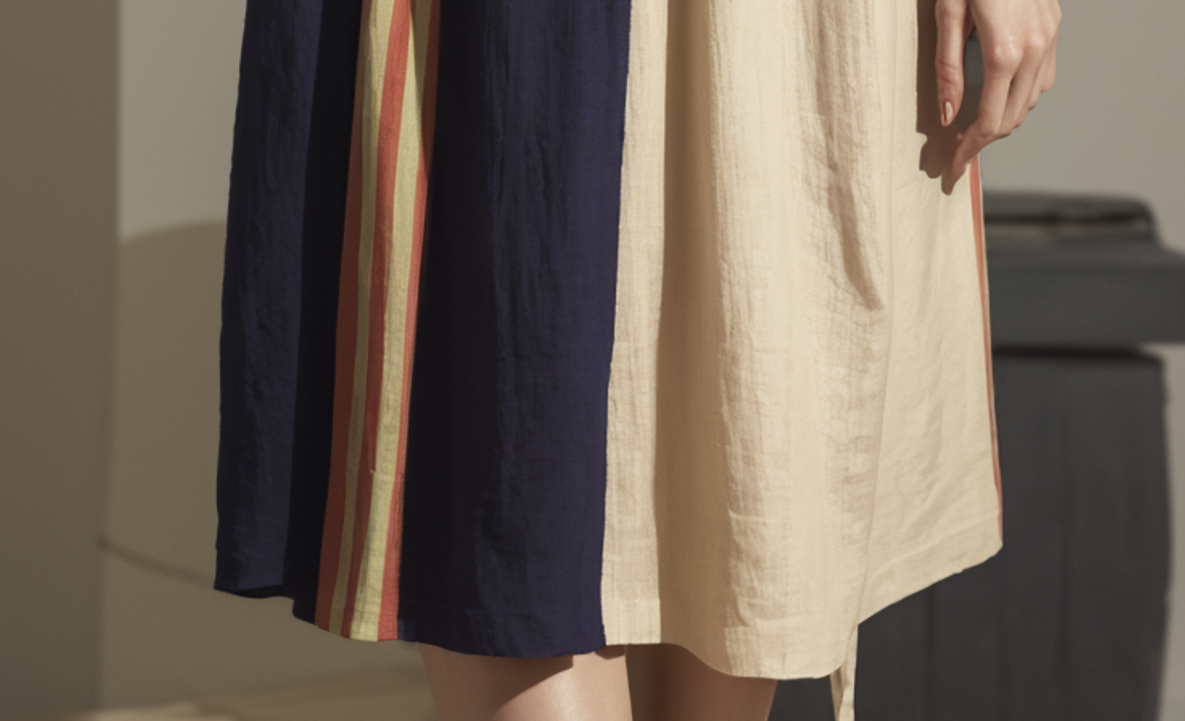 Loose colour blocked round neck cotton striped asymmetric short sleeve dress