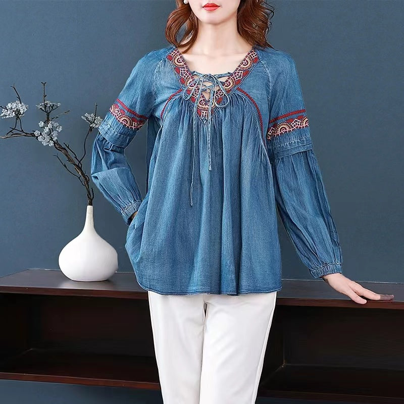 Loose Embroidered Geometric Tie Long Sleeve Denim Top