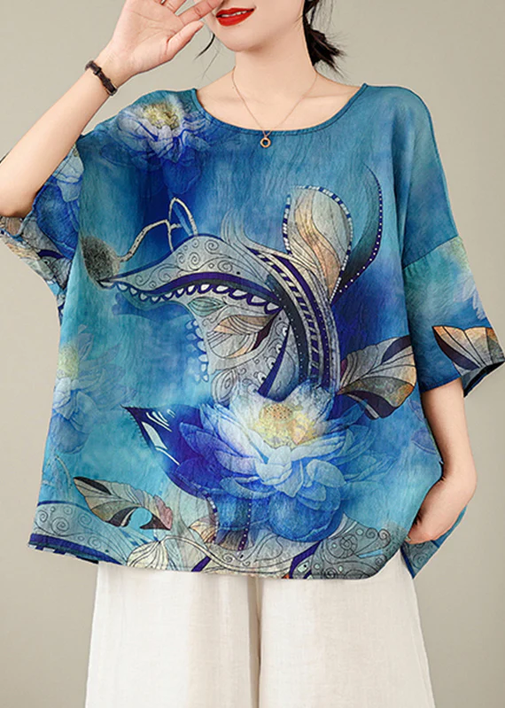 Loose Round Neck Printed Top Short Sleeve Bat Sleeve