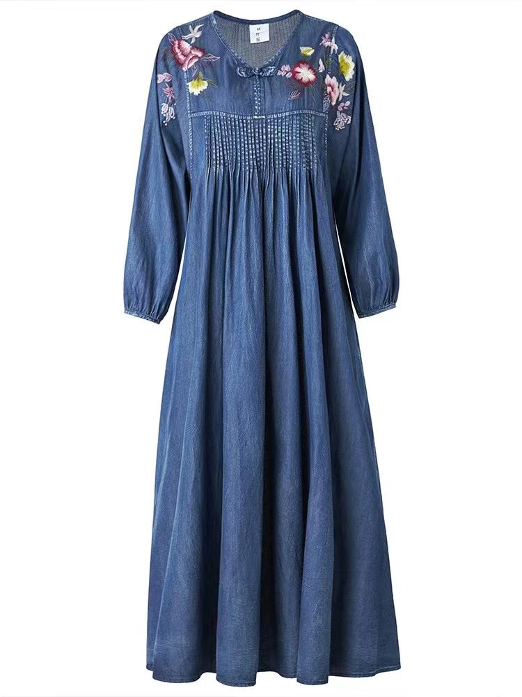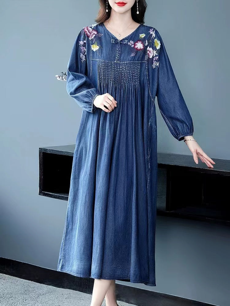 Loose V-Neck Embroidered Button Shredded Pleat Long Sleeve Dress