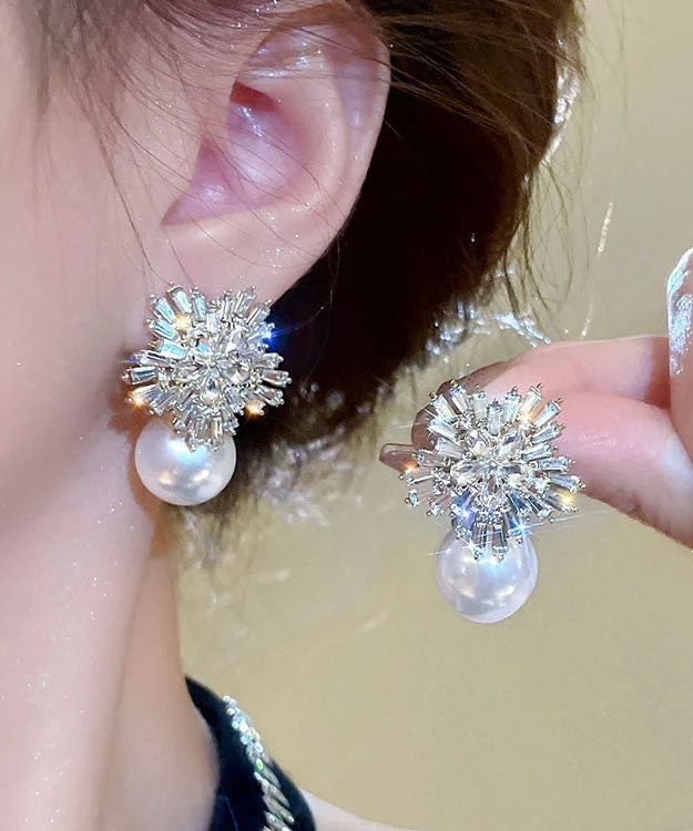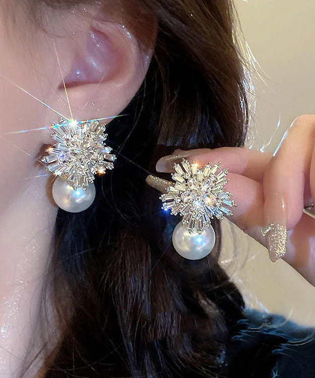 Luxury Peplum Gold Pearl Zirconia Flower Stud Earrings