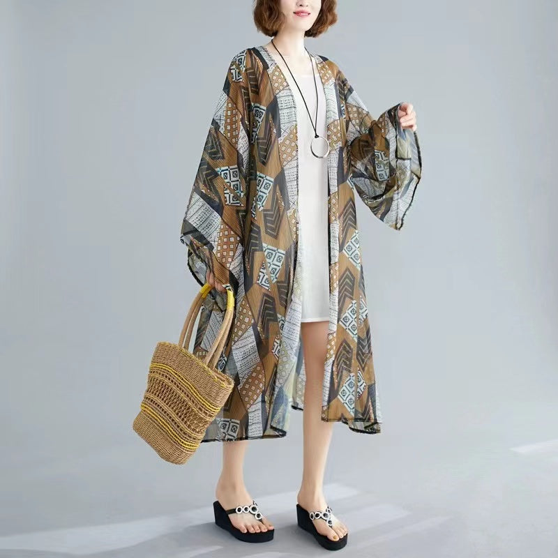 Plus Size Printed Beach Sun Screen Long Cardigan Jacket