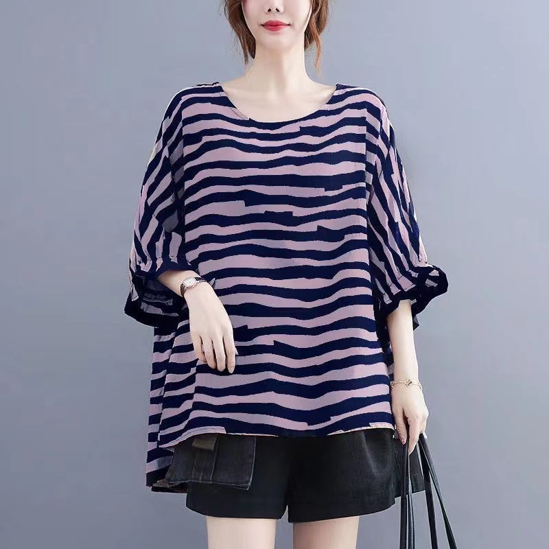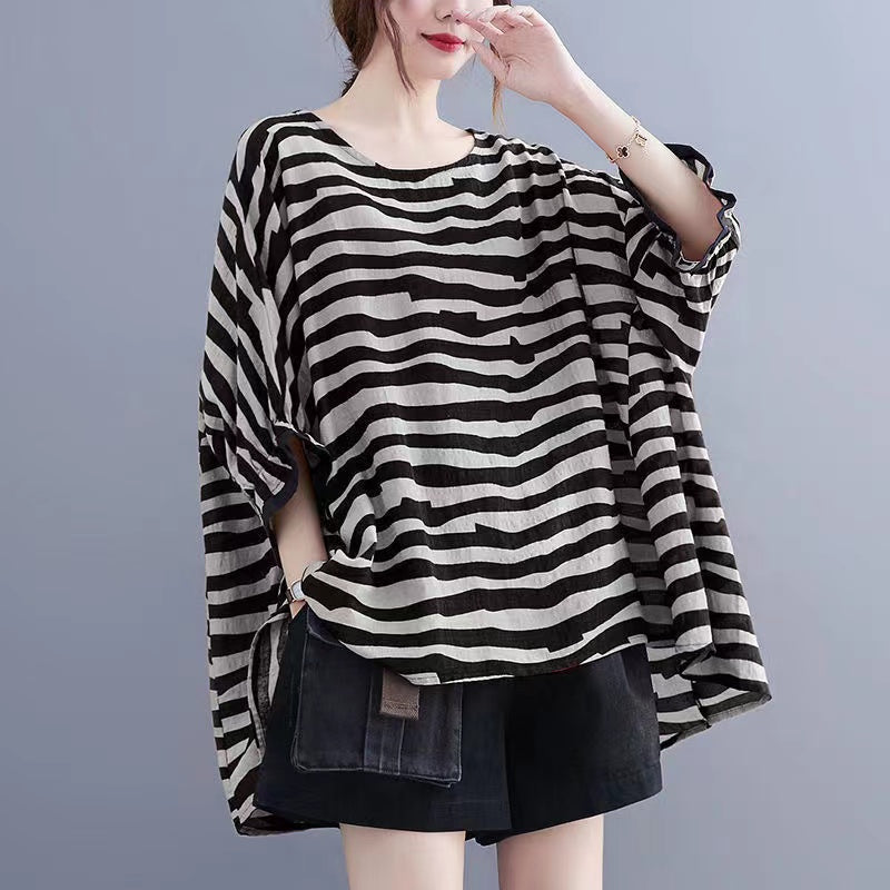 Striped Asymmetric Patchwork Cotton Batwing Sleeve Top
