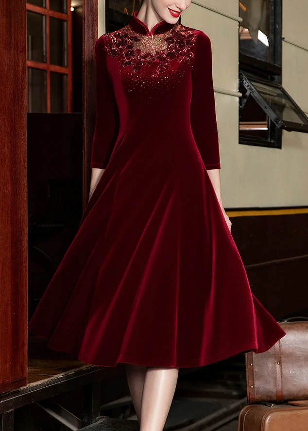 Women's Elegant Stand Neck Beaded Cotton Velvet Long Dress Bracelet Sleeve